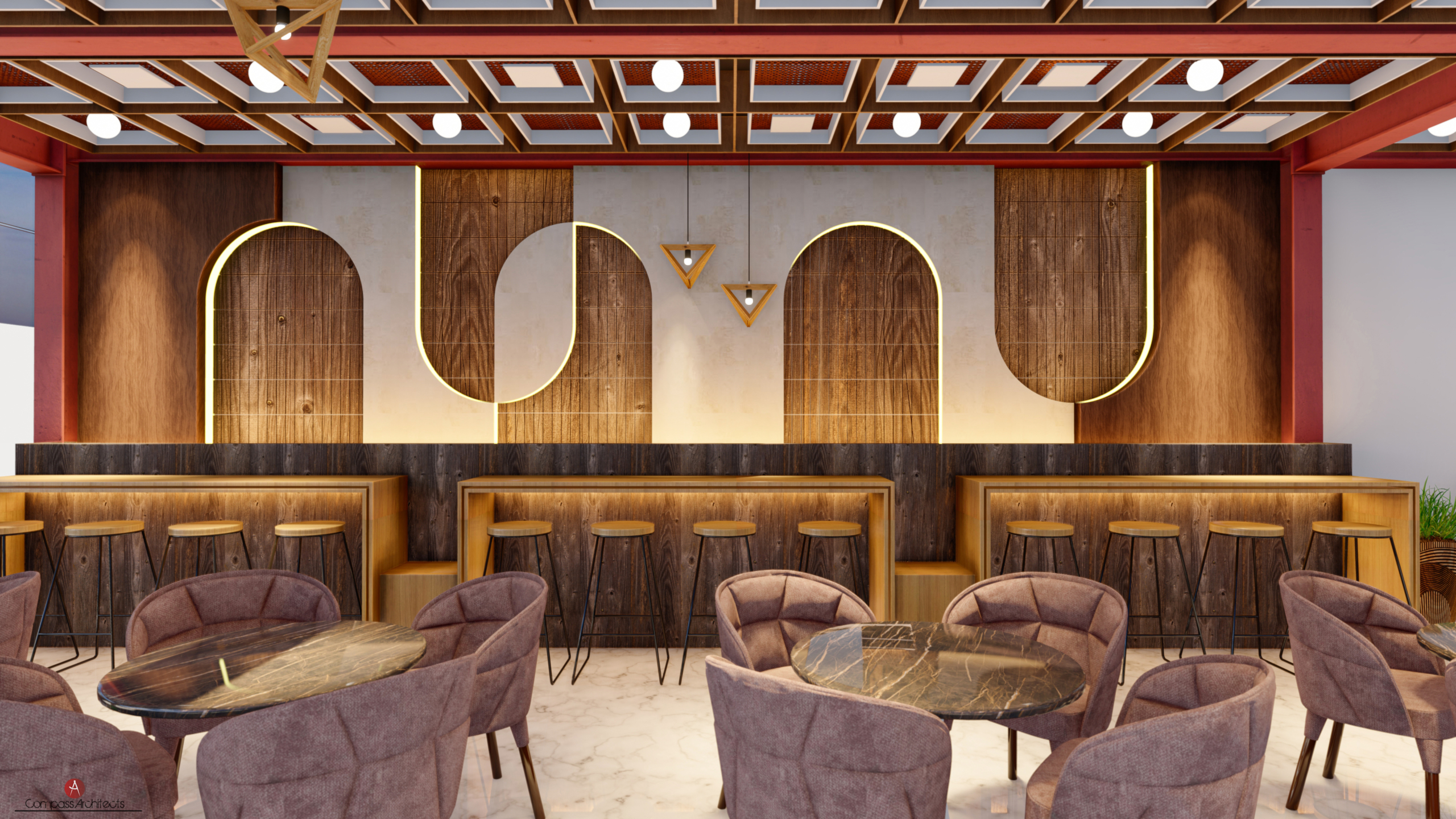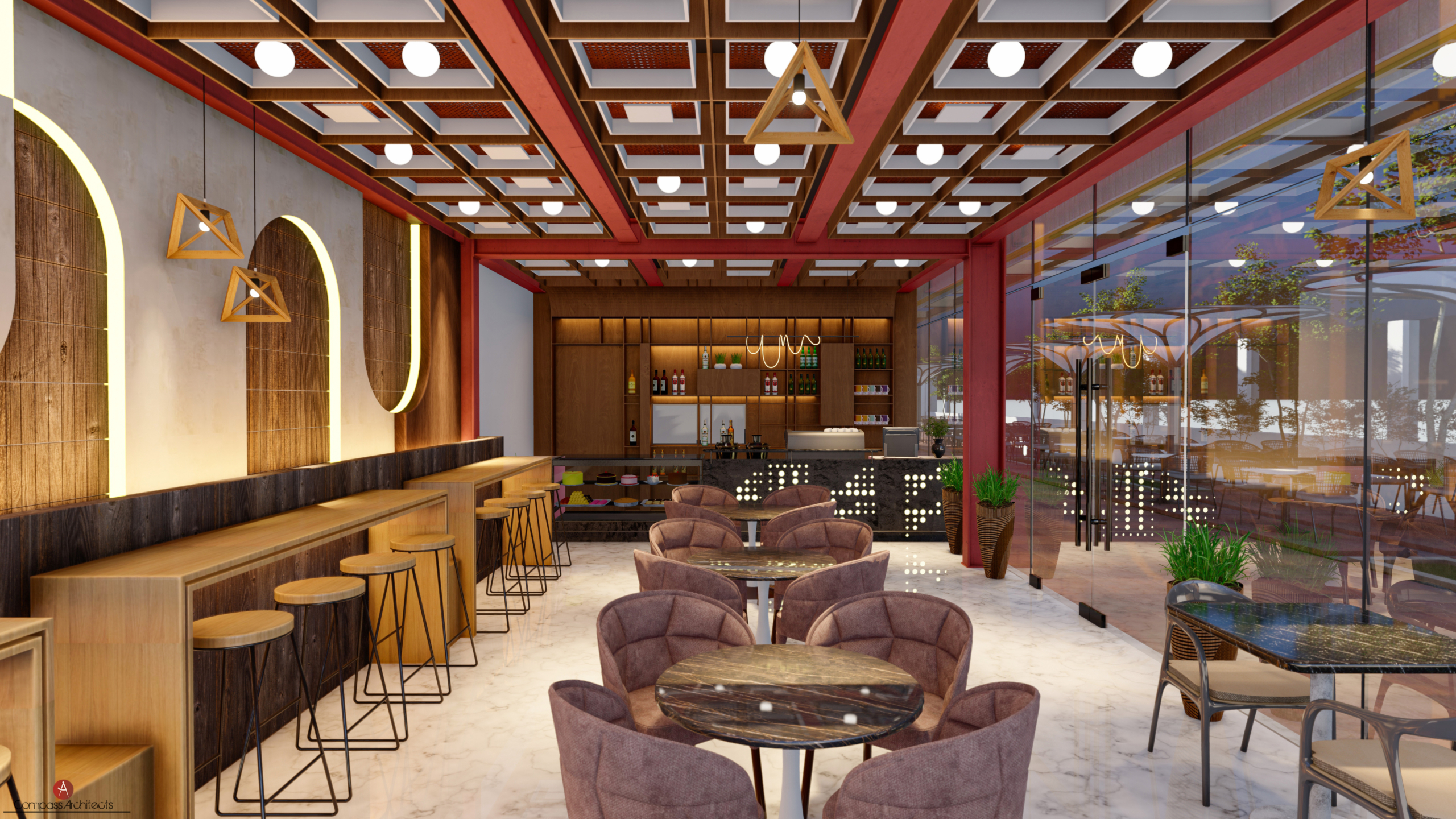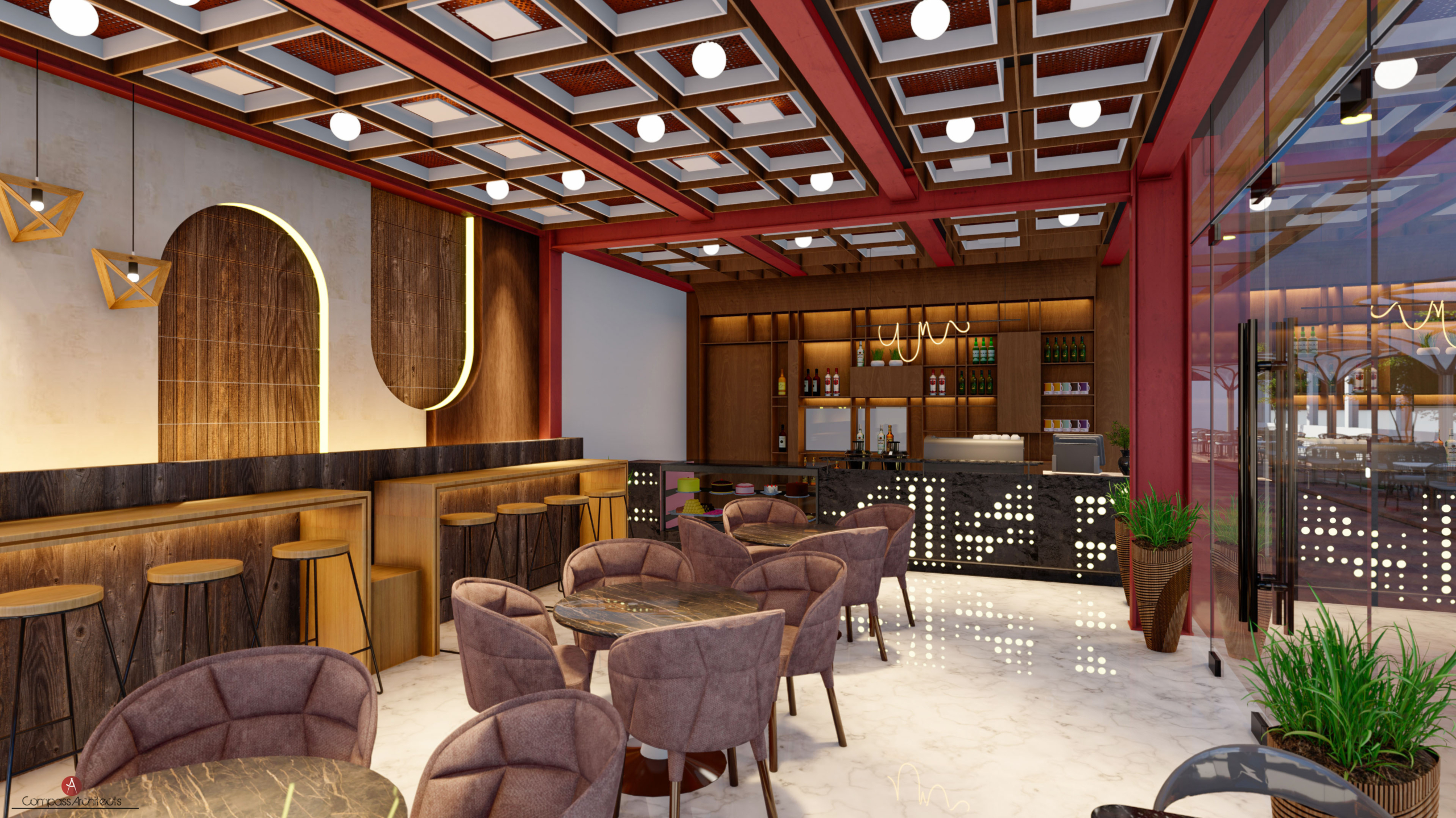 This restaurant design seamlessly blends indoor and outdoor spaces, creating a welcoming atmosphere that connects nature with modern luxury. Inside, the warm wood tones and elegant marble accents offer a refined, cozy setting for guests. The unique seating arrangement adds a touch of creativity, inviting diners to relax in comfort. Stepping outside, the outdoor seating area is carefully integrated into the environment with stylish, modern canopies and lush greenery, enhancing the overall experience. The relationship between the indoor elegance and the outdoor freshness provides a harmonious dining experience, perfect for any occasion.